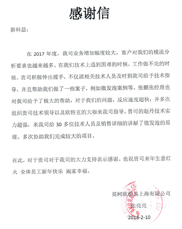 英柯歐模具(上海)有限公司-感謝函