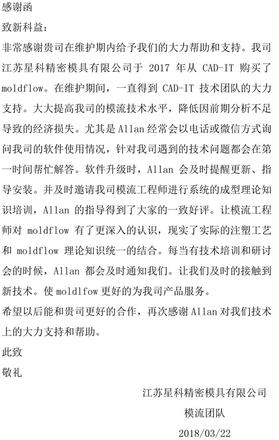 江蘇星科精密模具有限公司-感謝函