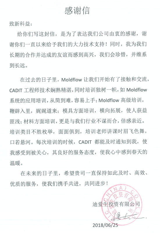迪愛生投資有限公司-感謝函