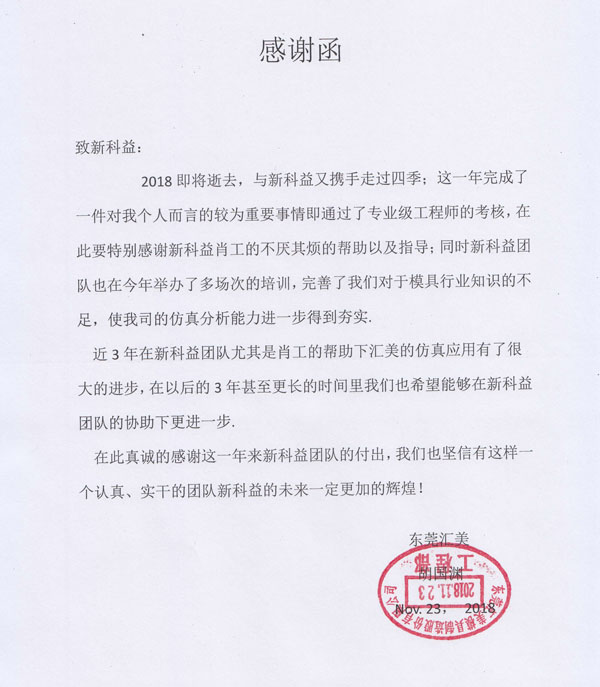東莞匯美模具制造有限公司-感謝函