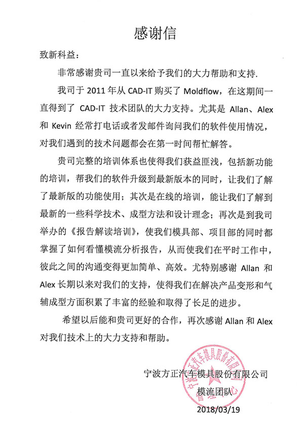 寧波方正汽車模具有限公司-感謝函