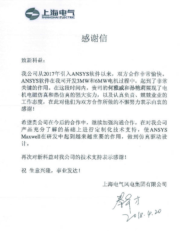 上海電氣風(fēng)電集團(tuán)有限公司-感謝函