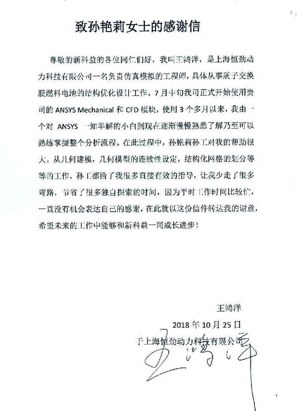上海恒勁動力科技有限公司-感謝函