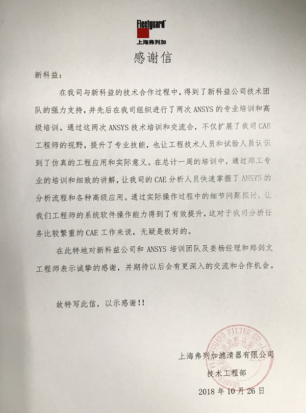 上海弗列加濾清器有限公司-感謝函