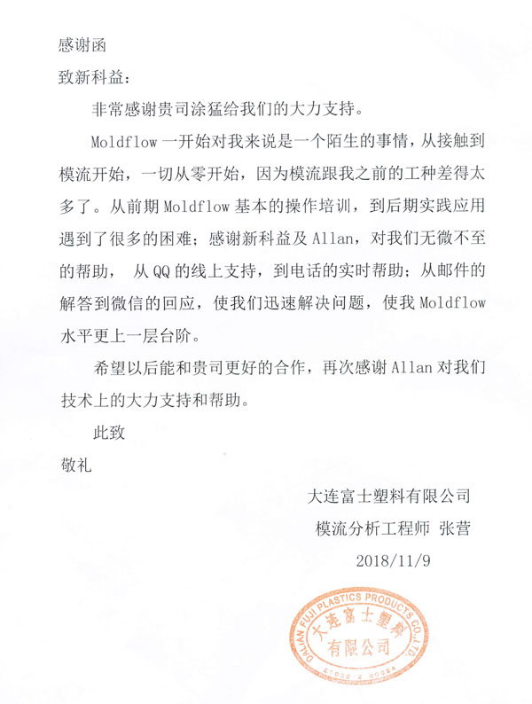 大連富士塑料有限公司-感謝函