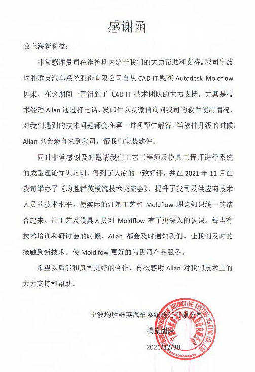 寧波均勝群英汽車系統(tǒng)股份有限公司-感謝函