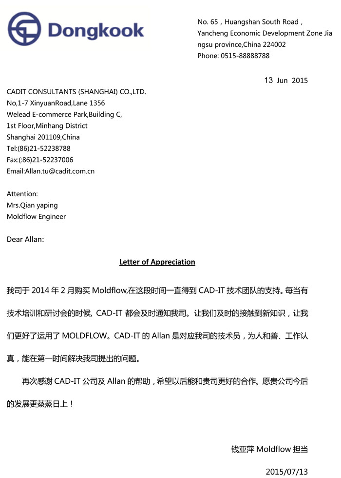 青島英聯(lián)精密模具有限公司-感謝函