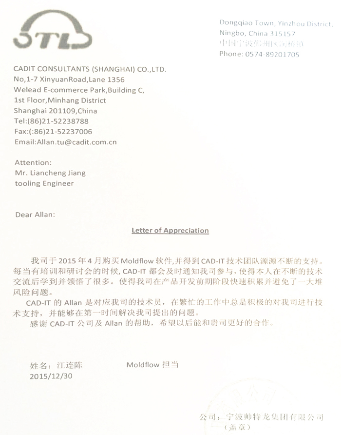 寧波帥特龍-感謝函