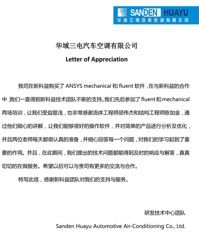 華域三電汽車空調(diào)-感謝函
