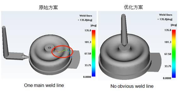 優(yōu)化澆口位置改善工藝條件 原始方案采用單點(diǎn)側(cè)進(jìn)膠,壓力損失較大,我們通過(guò)優(yōu)化進(jìn)膠方式和位置,采用單點(diǎn)進(jìn)膠方式,從而優(yōu)化了工藝條件,得到理想成型工藝。 優(yōu)化流道系統(tǒng)改善充填平衡的問(wèn)題 如下為汽車(chē)橡膠配件,原始方案中我們可以看到充填不平衡,我們知道,充填的平衡型直接影響到制品的精度。所以我們利用Moldflow軟件執(zhí)行流道平衡分析,通過(guò)右圖優(yōu)化后的方案可以看出,整個(gè)填充過(guò)程幾乎達(dá)到平衡狀態(tài),符合模具設(shè)計(jì)原則。 |