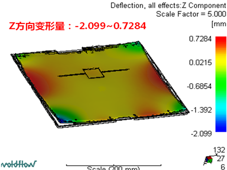 優(yōu)化模具水路改善變形 對于平板產(chǎn)品,變形是非常難控制的,Moldflow可以幫助提前預(yù)知變形量和變形原因,進(jìn)而提供改善方案。 下圖案例是筆記本顯示屏上蓋,產(chǎn)品變形趨勢為中間下凹,四角往上翹。 |